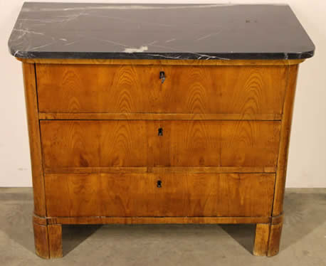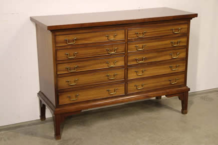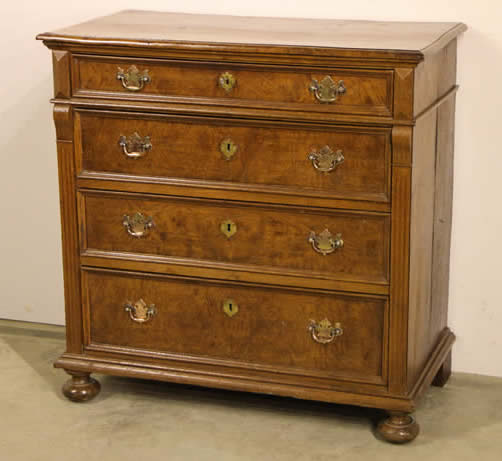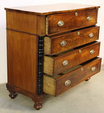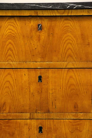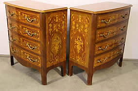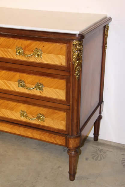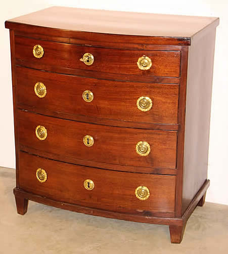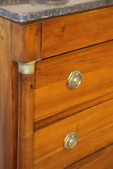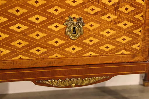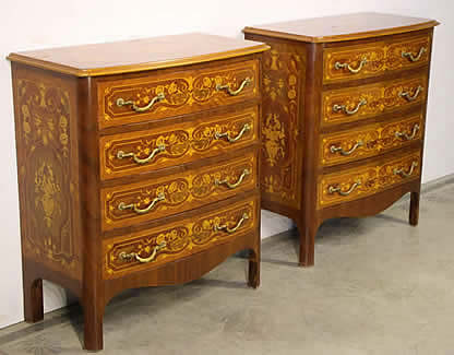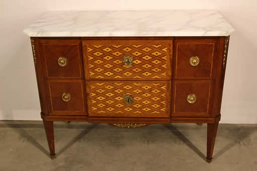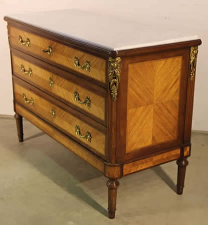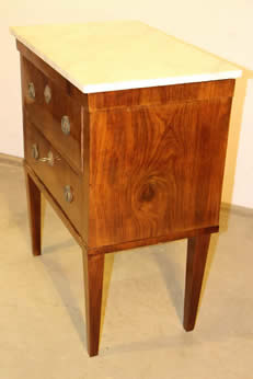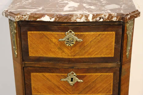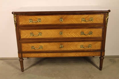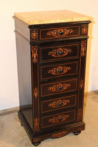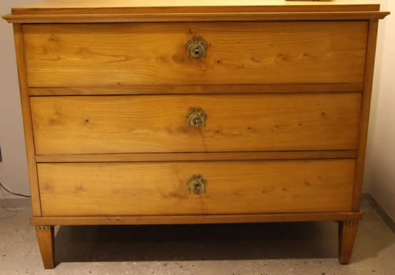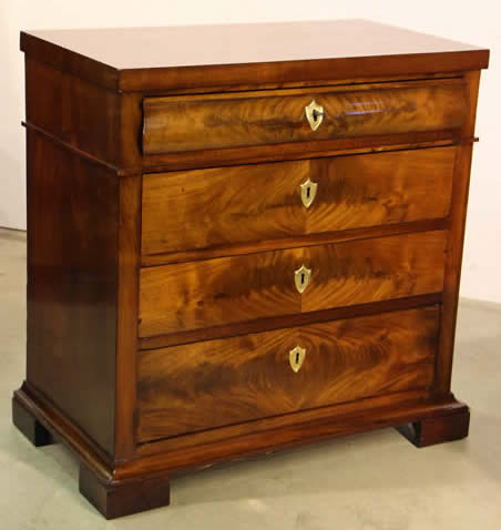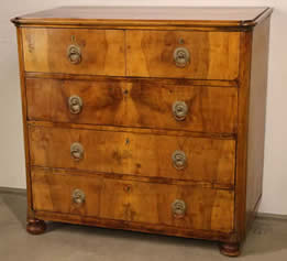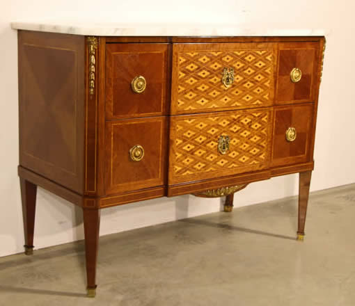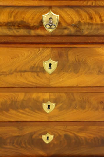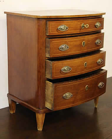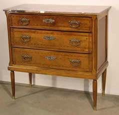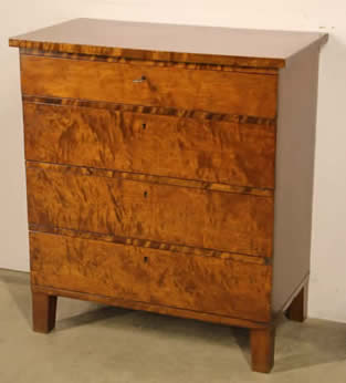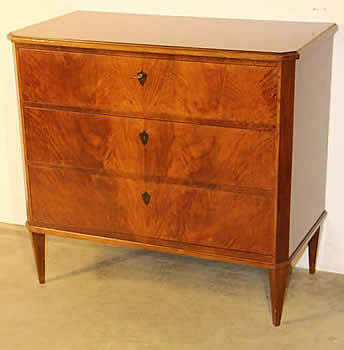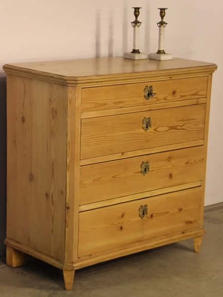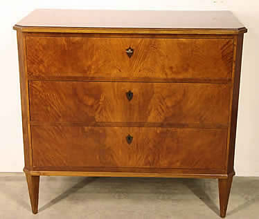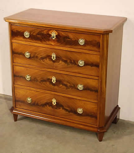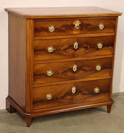 This classic chest with four drawers with canted corners and tapering legs all with precision brass inlay and mounts most likely from the Eskiltuna workshops.