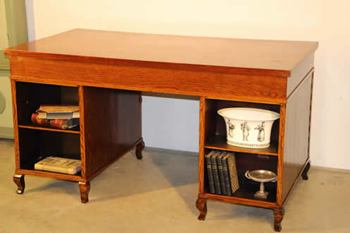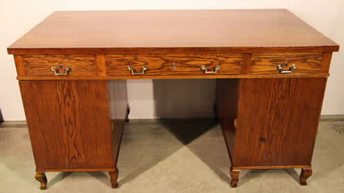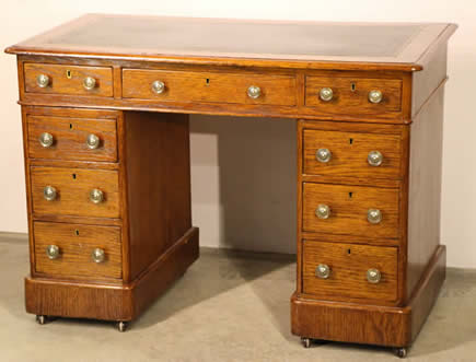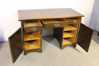 table or desk . This sturdy desk with beautifully solid oak pedestals and three oak drawers fitted into the apron. ideal as a student desk, it is well polished in dark oak and retains its original patina. Two keys supplied and all locks work well.