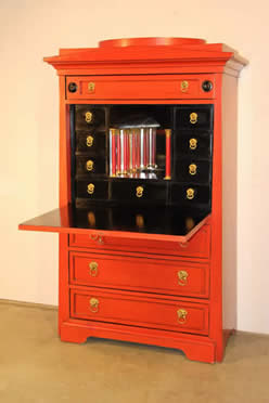 back into the cabinet and reveals multiple drawers and secret compartments with