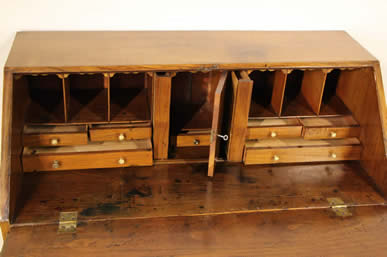 The fall front writing surface with traditional pegged construction and molded frame opens with a steel key revealing two flights of drawers , compartments and a matching central door inside thw writing area.