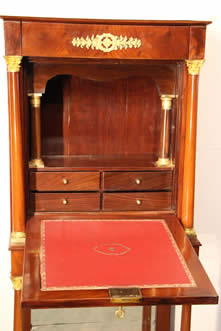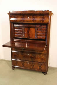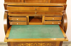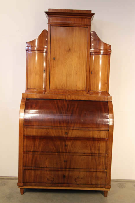 Description Biedermeier cylindre top desk in mahogany with many sliding compartments and secret drawers etc. Nice curved front lowers drawers flanked by full columns.