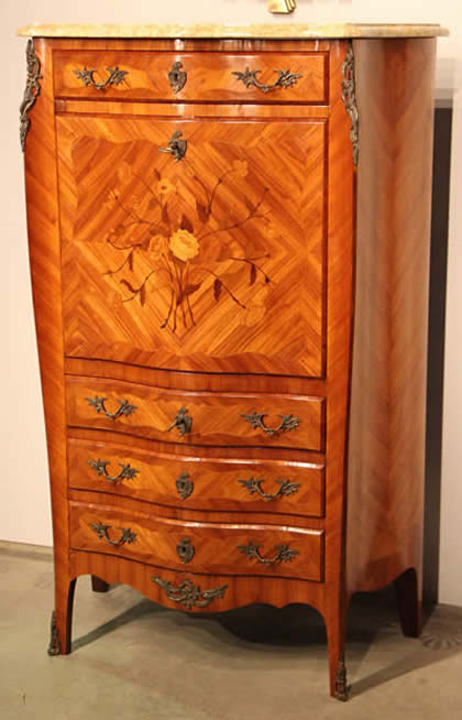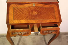 marquetry inlay. The pull out writing surface drawer also holds three