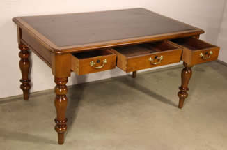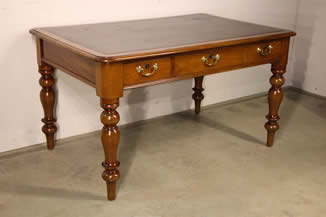 A walnut and cigar leather writing table .