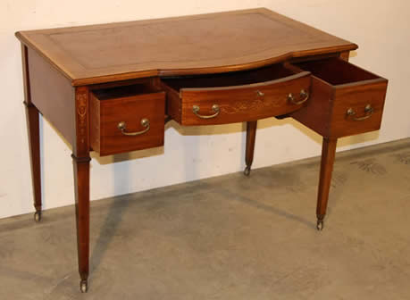 Description English Sheraton style desk with breakfront shaped drawers and lovely inlay and ornate gilt brass handles.