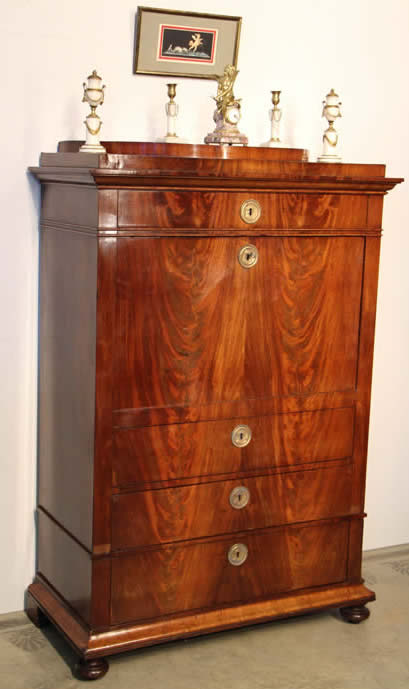 Beautiful flame mahogany Biedermeier cylinder top desk bureau on chest with