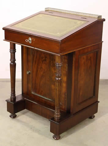 A gorgeous antique English Davenport desk in mahogany and flame mahogany. Polished al round to stand in the middle of a room, this practical small desk has an original gothic pierced brass gallery on top and a green gilt tooled leather writing slope. A working lock and key opens the compartment below with is loosly fitted with a shelf and two divisions. Below this and flanked by turned and fluted columns is a single door that opens a full compartment . All sides front and back with central flame mahogany panels. The whole raised on turned bun feet.