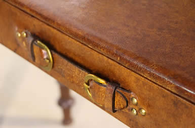 The whole suitcase top with intergated drawer with brass belt buckle handle. brass studs and buckles add to the charm of this warm used writing table or console .