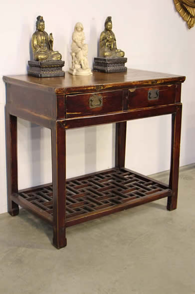 | Title Antique Chinese elm scholars desk with ornate lattice foot rest |