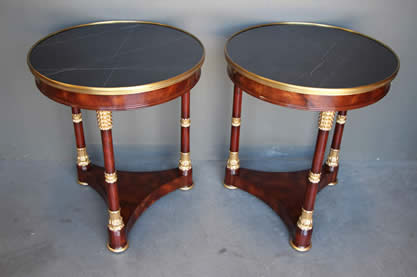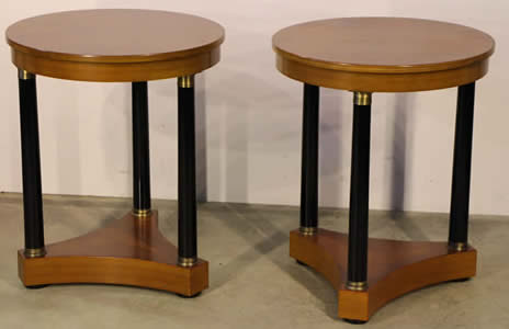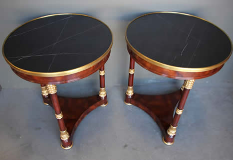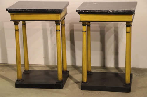 A pair of vintage Empire style carved and turned pear wood lamp tables. The elegant shaped moulded frieze below the black marble tops with fitted single drawer and bronze handles. Raised with four architectural Ionic columns with turned capitals and bases and mounted on a plinth base. The columns being angled inwards towards the top in the ancient architectural Roman manner. Good original painted finish and in superb condition for their age. These pair of tables are ideal as bedside tables or lamp tables as they are finished all round so can be placed in the centre of a room.