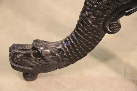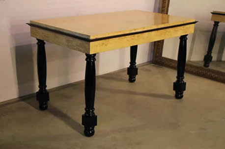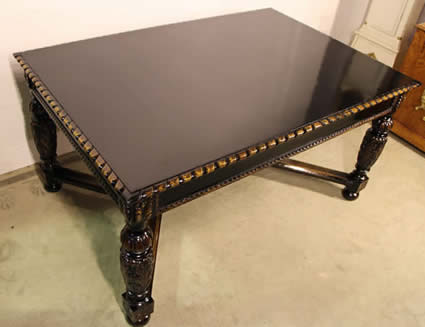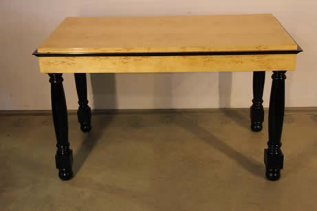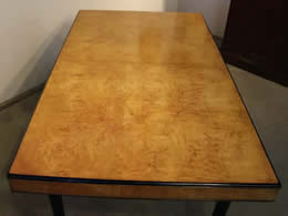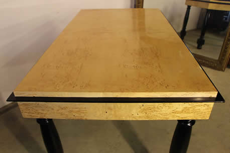 | Title large Blonde Art Deco burl elm dining table with figurative veneers and ebonised top | |