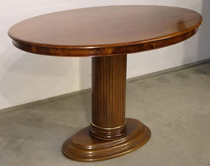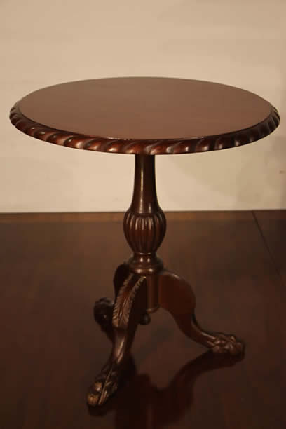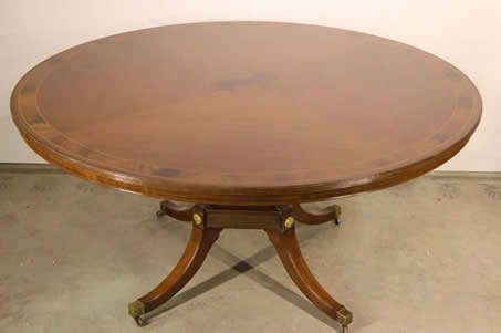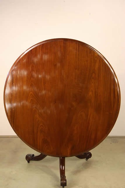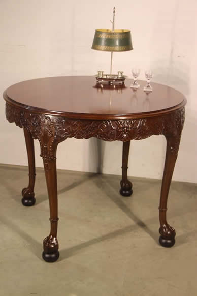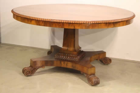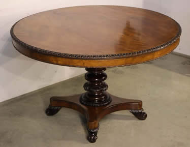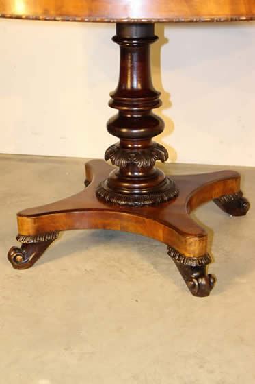 Description Centre table 6471 Vintage mahogany centre or lamp table in flame mahogany top with carved border. In the English Regency manner this Scandinavian mahogany round centre table raised on carved reeded column to platform base and curved scroll feet. Ideal as use for a games table, lamp or bedside table. Polished all round. Beautiful quality craftsmanship with superb selection of timbers.