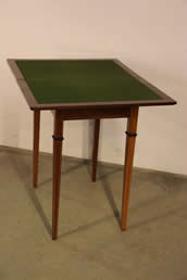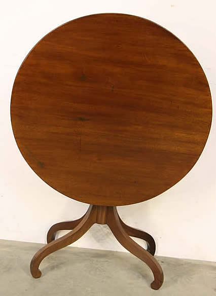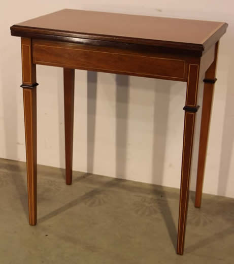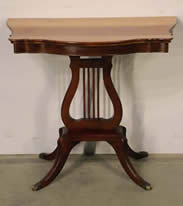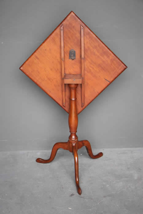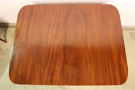 The table with gorgeous solid mahogany top that flips on wooden hinges and has a brass lock underneath to secure it firmly to the base. The raised rim edge is a nice touch and confirms the quality of this solid mahogany top. Good original patina is a value point with a few minor restorations commensurate with age and use.