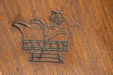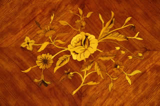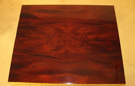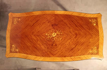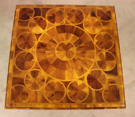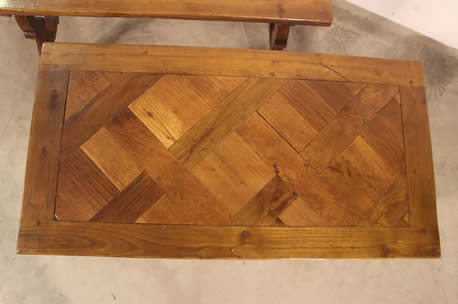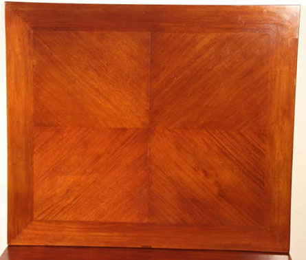 The solid parquetry top has a superb polished patina in solid mahogany.
