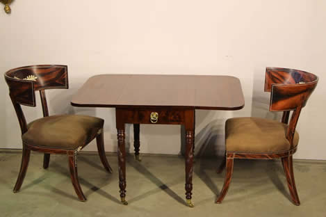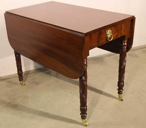 Original l polished blonde mahogany top with two drop side extensions over a two fulll depth drawers with turned empire bronze knobs and ormolu escutcheons. A working key is supplied. All actions work smoothly and have been serviced. The drop sides hinge up and are supported from underneath with pull out rails.