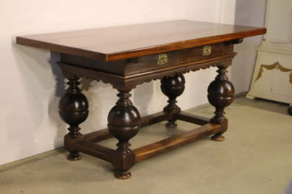 Solid oak refectory table with solid twin plank top and ornate carved balluster pedestals. This 16th century original table with original pegged construction and good patina. A full width oak drawer below the top may have been added in the early 1800's and has a gorgeous solid bronze handle. Antique original tables such as these were usually made moveable from chateau, city castello or to country house and needed to be easily assembled. The original pegged construction and lovely patina speaks volumes. This period Renaissance design has been used in Northern Italy, France and England since the 1400's. Ideal use as a hallway table or even as a desk.