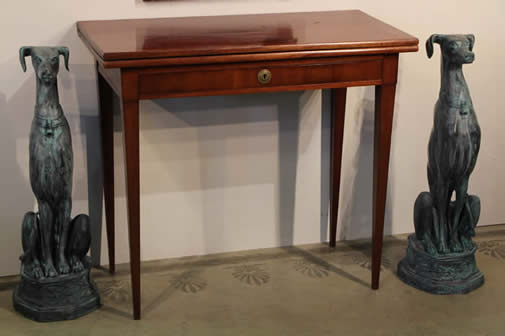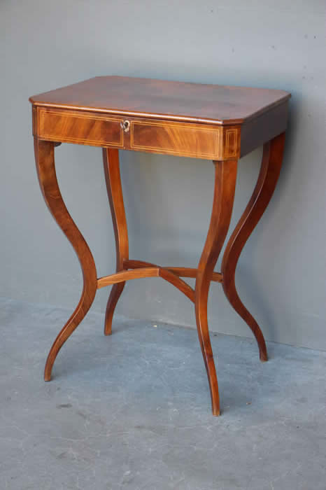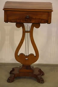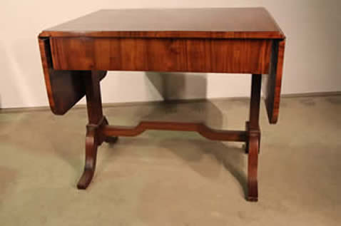 Description Sofa table 6377 Antique Empire sofa table writing desk raised on four sturdy turned columns to sabre legs and 2 drawers.