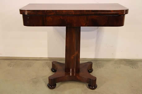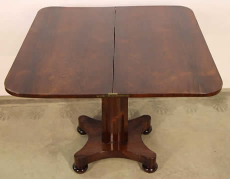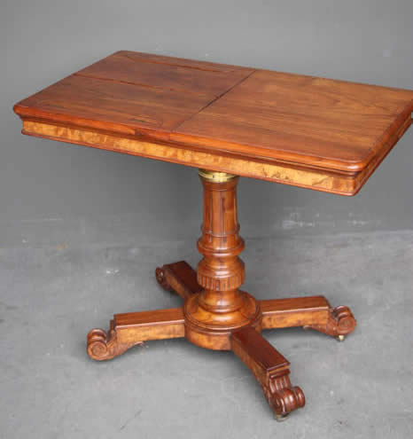 Antique English Regency rosewood fold over tea table in well figured Brazillian rosewood / Jacaranda. the top swivels and folds open to reveal bookmatched figurative veneers on both sides. Raised on a concave shaped tapering column in the simplest of styles, this table could easily be mistaken stylistically for an Art Deco piece, a design period that arrived 100 years later. The Regency period also heavily influenced the continental Biedermeier simplicity.