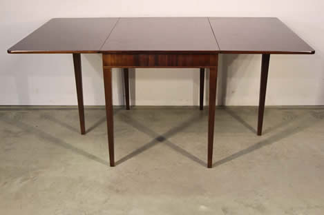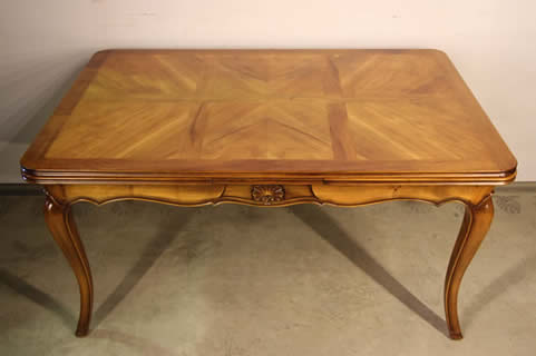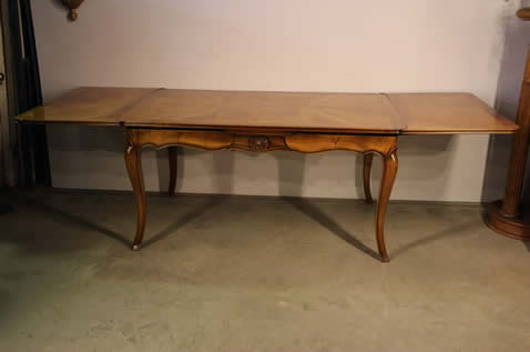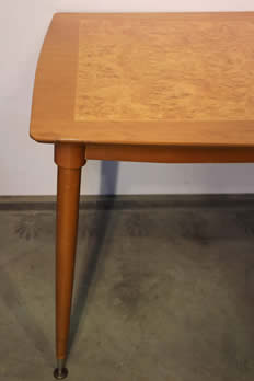 Original polished blonde ashwood top with marquetry inlay. Two drop side extensions over a shaped apron with inlaid panel. The drop sides hinge up and are supported from underneath with pull out rails.
