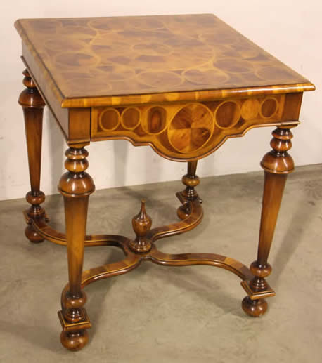 | Title Vintage Scandinavian blonde oak marquetry wine table with ornate rosewood inlay top on turned base | |
