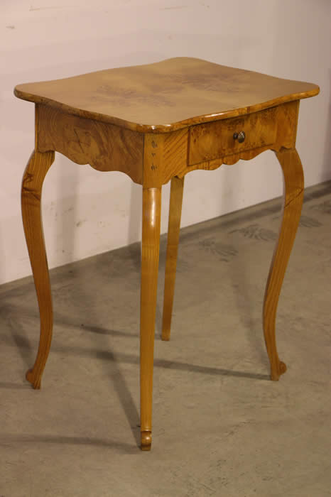 Description Birch table 5500 Antique solid Swedish blonde birch writing table desk raised on sturdy turned legs with dropside extensions. Karl Johan period circa 1820 A well polished solid satin birch top with two extensions over a full depth drawer with brass empire handle. the drop sides hinge up and are supported from underneath.