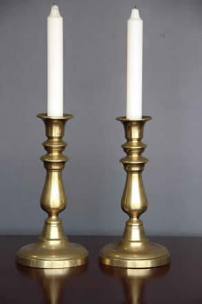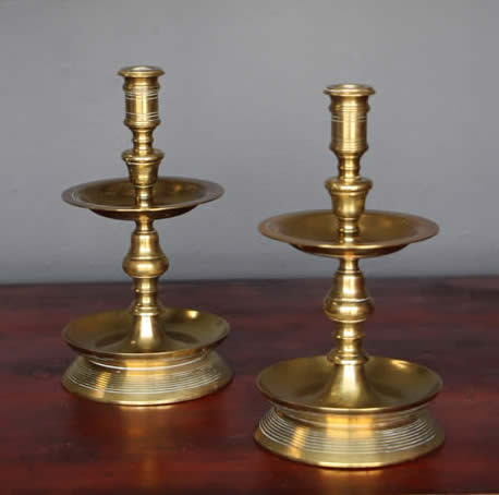 Pair antique Dutch Heemskerk solid brass candlesticks with mid level wax