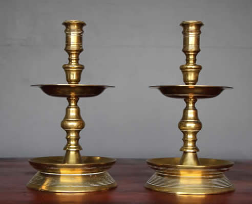 Made of solid brass engine turned and very heavy, these baroque candlesticks are known as the Heemskerk style as they have a mid level was drip tray. In addition these also have a rare lower wax drip tray integrated into the heavy turned brass base.