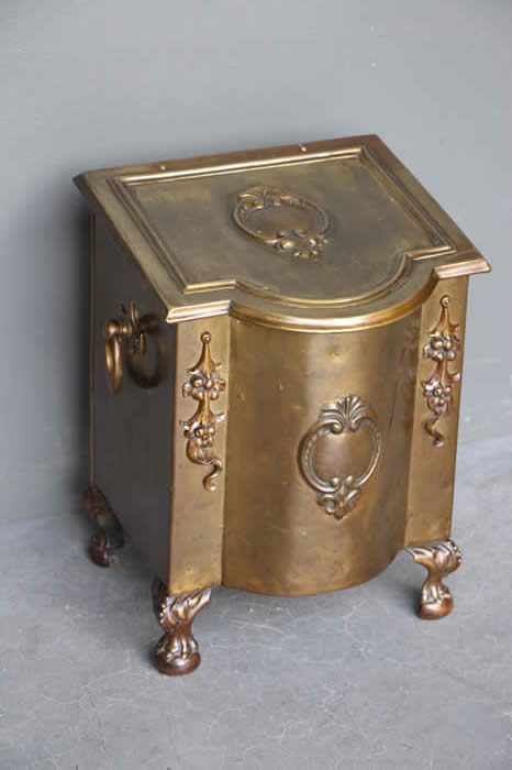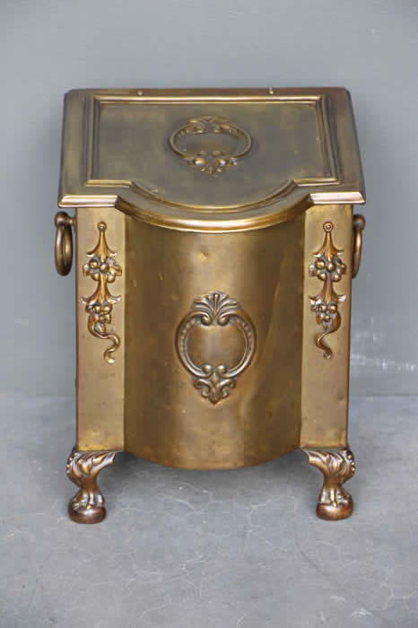 Antique brass log box coal bin with ornate cast brass embelishments rasied on lions paw feet.