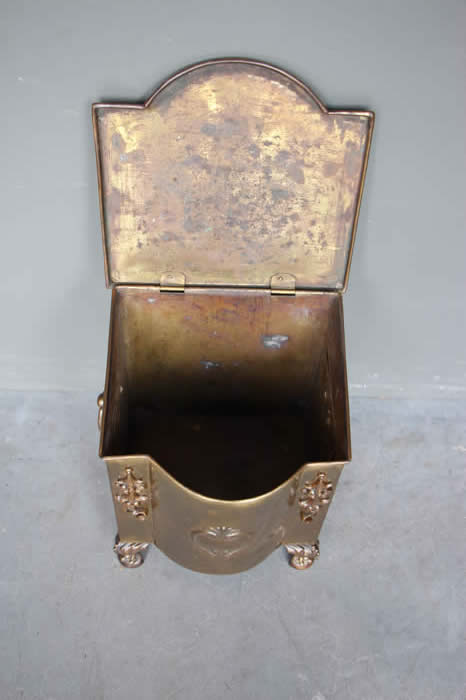 | Title Antique brass log box coal bin ideal waste paper basket on cast brass lions paw feet Edwardian 1905 |