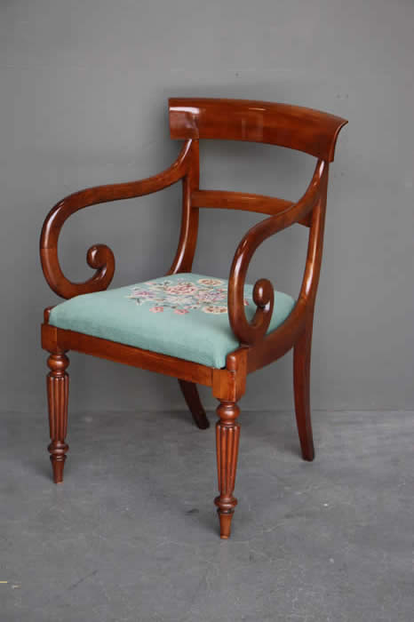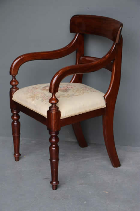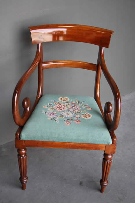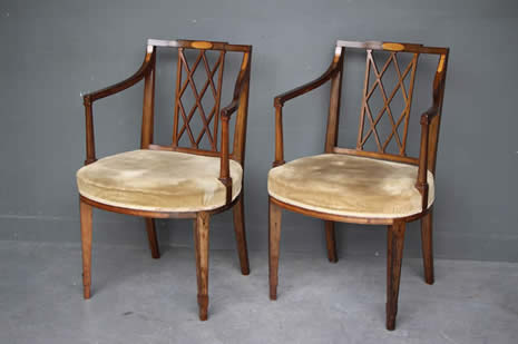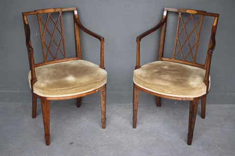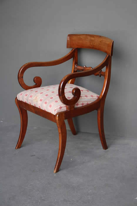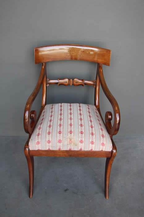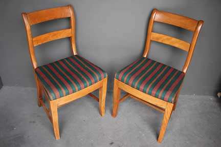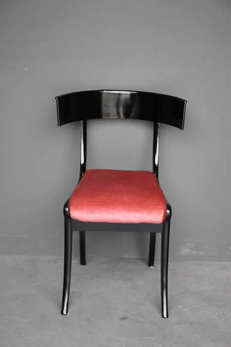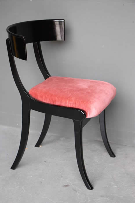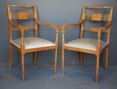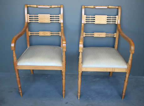 The well carved wooden chair frames with traditional pegged joint construction as used in the 18th century tradition. The four peg securing of the legs to the frame was traditional to George Jacob.