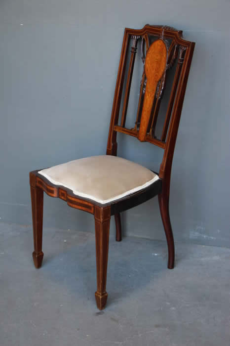 French antique set of 6 lyre back chairs with carved details in the Louis XVI manner signed stamped seat rail Chartier.
