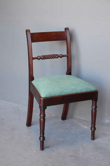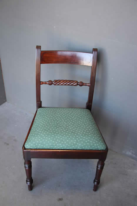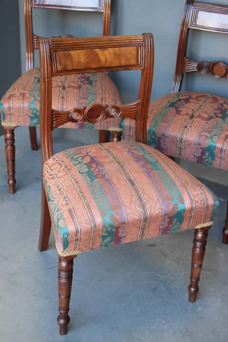 The seats in duck egg blue silk but unfortunately with minor water marks to fabric due to a faulty shipping container seal. All seats were reupholstered around 10 year sago and can be used as is or simply covered with loose tie back fabric.