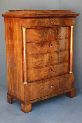 This classic chest with four drawers with canted corners and tapering legs all with precision brass inlay and mounts most likely from the Eskiltuna workshops.