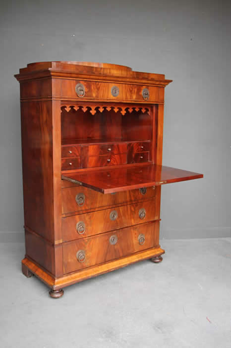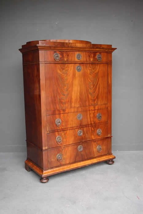The very top drawer pulls open in the traditional minimalist  Biedermeier manner with a key. A brass locking mechanism and hinges allows the drawer front to fall flat to reveal a fitted interior. Below this drawer is a serpentine or scoll shaped desk top. It rolls back within the cabinet revealing a fitted interior with drawers and central door.