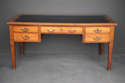 French Louis XVI style or Directoire Bureau Plat desk, raised on turned and fluted legs with fine brass turned mounts and gilt engine cut gilt bronze inlaid panels.