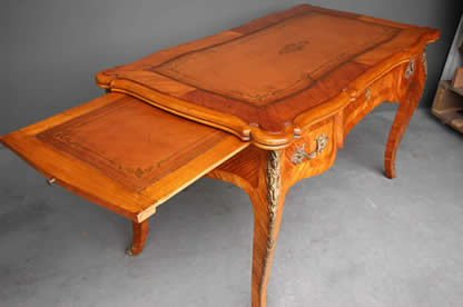 The serpentine shaped top with gilt tooled leather surface surrounded by kingwood and carved edging.  The original leather desk top has two extension slides underneath the ends also with gilt tooled leather inserts all with a lovely well cared for patina. These add W52cm x D40cm each.