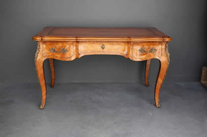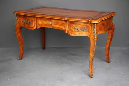 Title  Antique French Louis XV writing desk in kingwood marquetry with leather top bronze mounts 1930