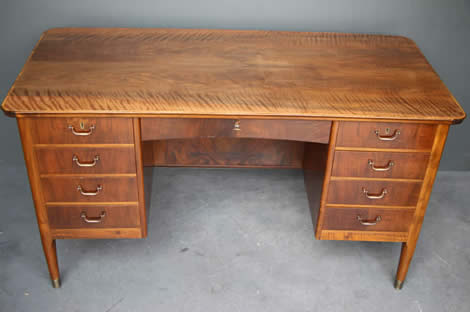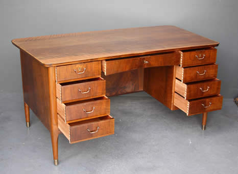 Highly sought after proportions of this desk is ideal for home office. The centre drawer with original brass key and working lock.  This is flanked by two pairs of deep drawers with brass handles . The drawer interiors in blonde birch with mahogany fronts. Original elegant bonze swing handles to all drawers.