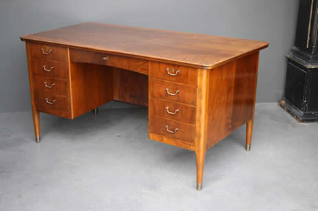 Title    Original Danish mid century 5 drawer desk mahogany gilt brass handles working locks circa 1955