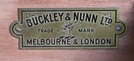 A bow front drawer with working lock and key and bearing the brass plaque of the maker Buckley & Nunn.
