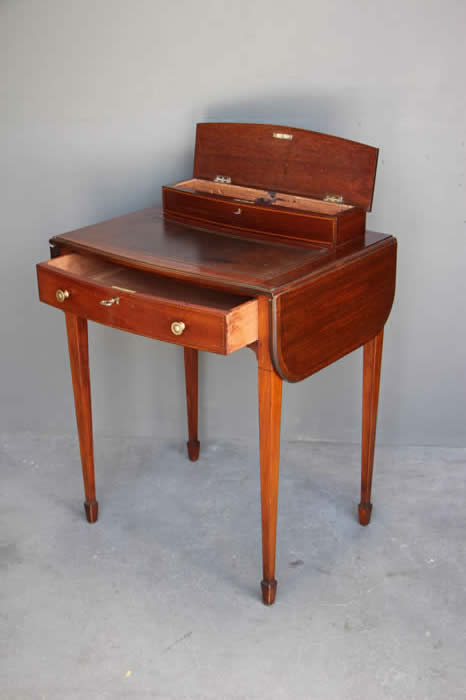 The elegant writing table in the Georgian Sheraton manner of the late 18th century.