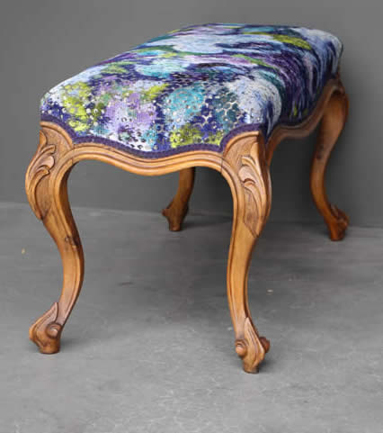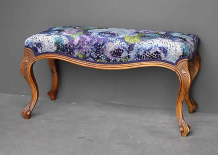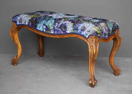 Title   French Louis XV carved rococo walnut long stool velvet brocade after Monet's Water Lillies painting