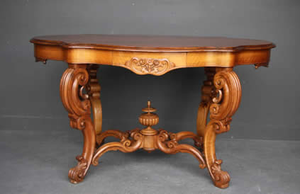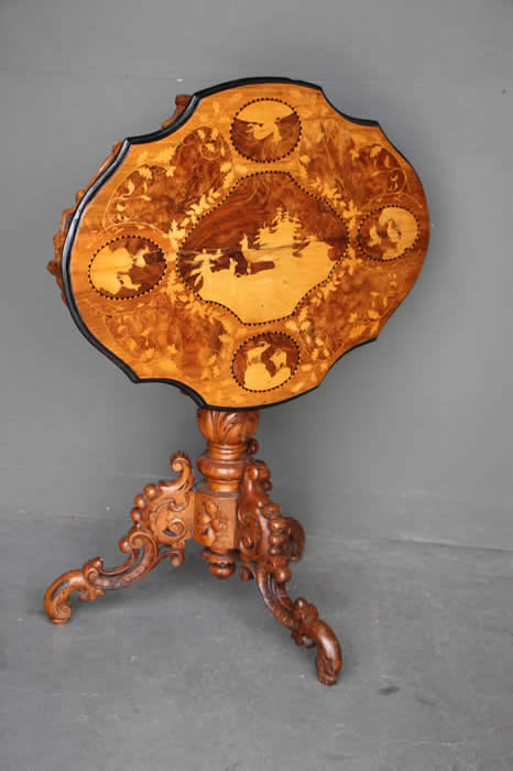 | Title Rare Swiss Alps Chalet wine table with superb marquetry inlay and ornate carved walnut structure 1880's | |