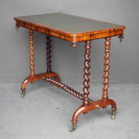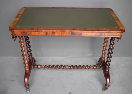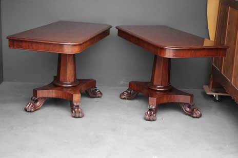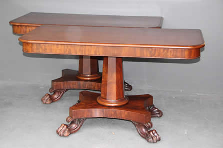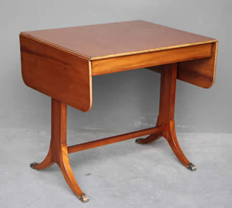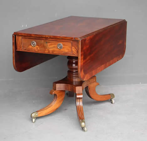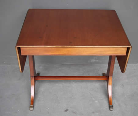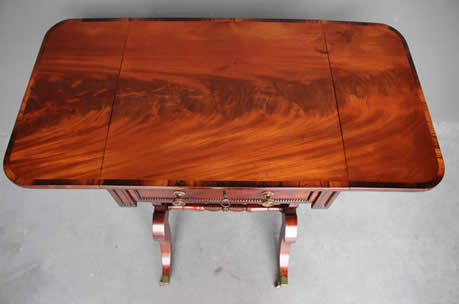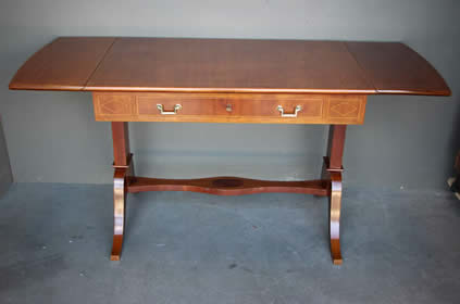 Description Sofa table 6377 Antique Empire sofa table writing desk raised on four sturdy turned columns to sabre legs and 2 drawers.