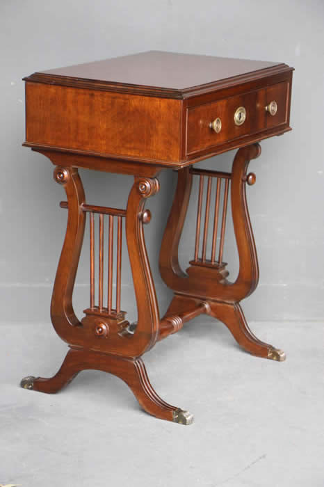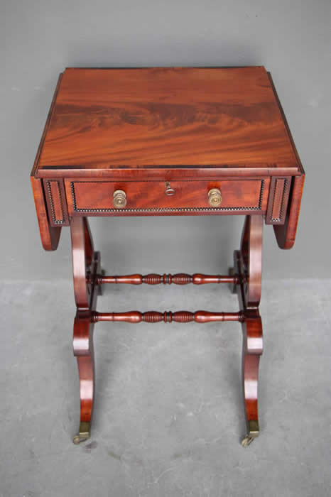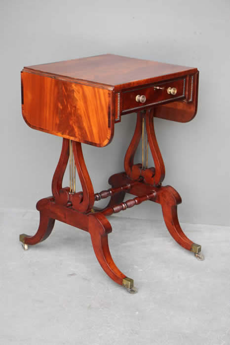 Original l polished blonde mahogany top with two drop side extensions over a two fulll depth drawers with turned empire bronze knobs and ormolu escutcheons. A working key is supplied. All actions work smoothly and have been serviced. The drop sides hinge up and are supported from underneath with pull out rails.