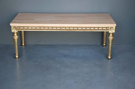 | Title Solid French oak top coffee table on carvedcolumns with platform base hand painted gilt patina 1960s | |