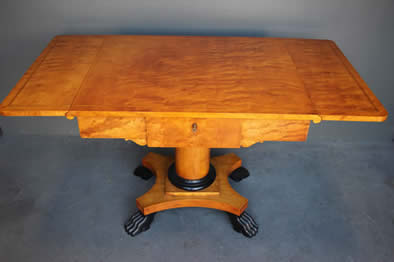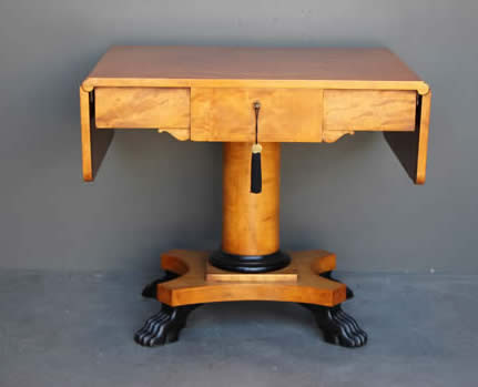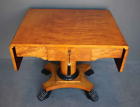 Description Birch table 5500 Antique solid Swedish blonde birch writing table desk raised on sturdy turned legs with dropside extensions. Karl Johan period circa 1820 A well polished solid satin birch top with two extensions over a full depth drawer with brass empire handle. the drop sides hinge up and are supported from underneath.
