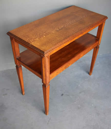 Ideal as a centre table, or lamp table or even as a very bedside table. Made in solid american oak . Original patina polish. Some marks to surface consistent with age and use. Polished all round so it can stand in the centre of a room.
