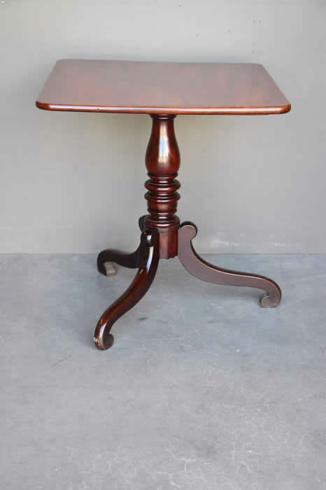 Description Antique Regency style wine table. In the late Georgian manner this gorgeous tilt top table with gilt tooled leather insert in olive green with cross banded mahogany edge, rest on turned column with four sabre legs. The top tilts up in the traditional manner with brass snap lock. Finished with a good patina and lovely condition. Of note: tables of these dimensions did not exist in the 18th/19th century hence these English mid century pieces filled the interior designers requirements. Height 49cm Width 50 cm Depth 37cm