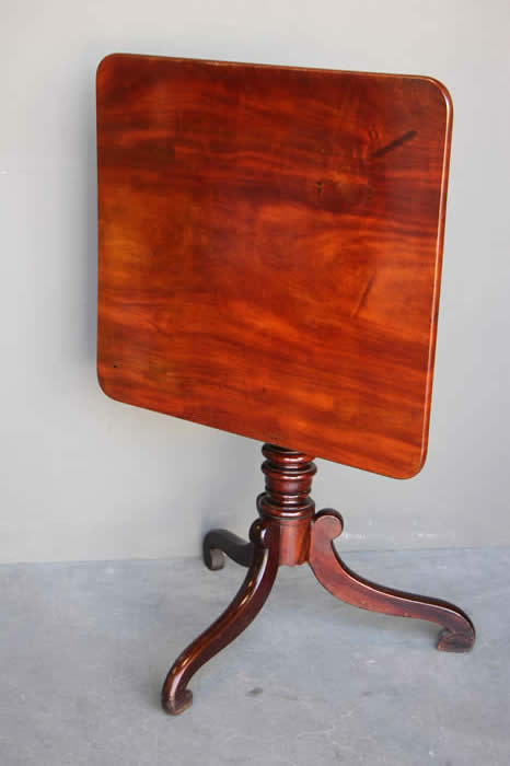 Antique English Regency rosewood fold over tea table in well figured Brazillian rosewood / Jacaranda. the top swivels and folds open to reveal bookmatched figurative veneers on both sides. Raised on a concave shaped tapering column in the simplest of styles, this table could easily be mistaken stylistically for an Art Deco piece, a design period that arrived 100 years later. The Regency period also heavily influenced the continental Biedermeier simplicity.
