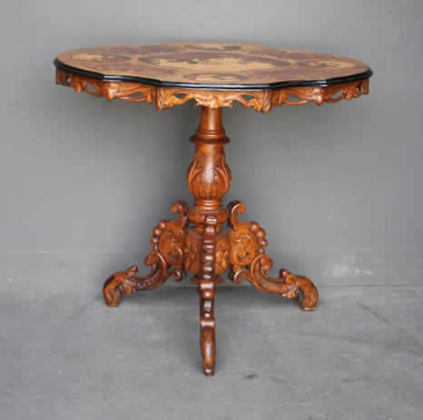 | Title Antique marquetry top Swiss wine table ornate naturalistic carved wood base and scalloped edge | |